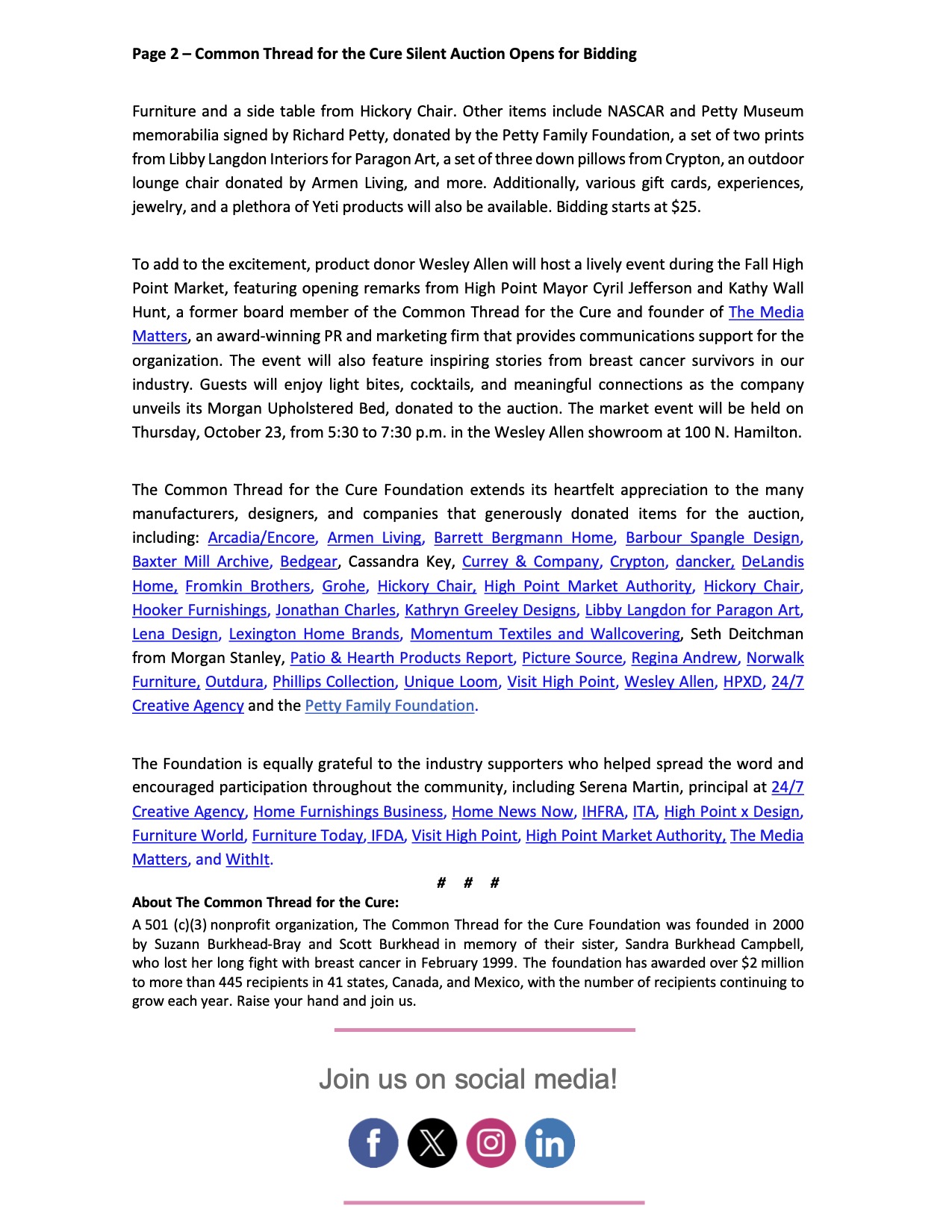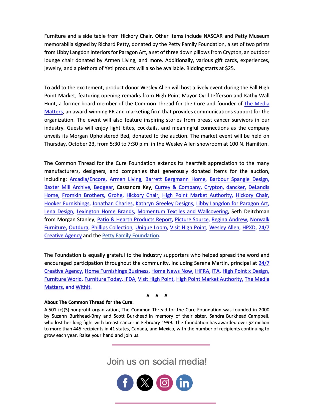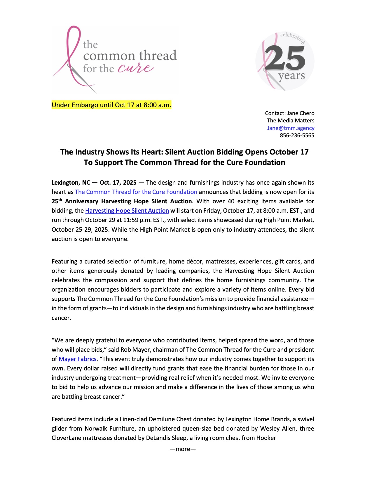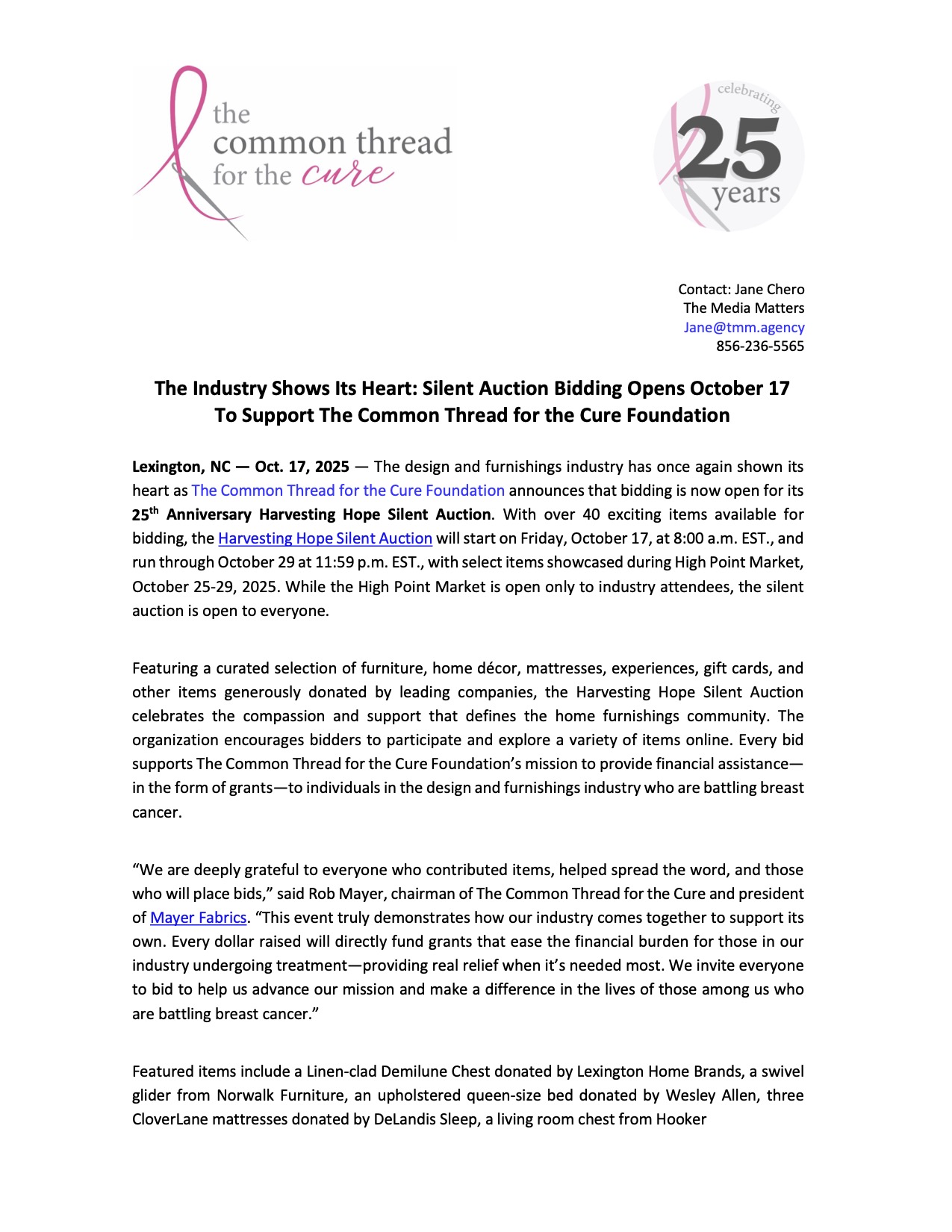 The Industry Shows Its Heart: Silent Auction Bidding Opens October 17 To Support The Common Thread for the Cure Foundation
